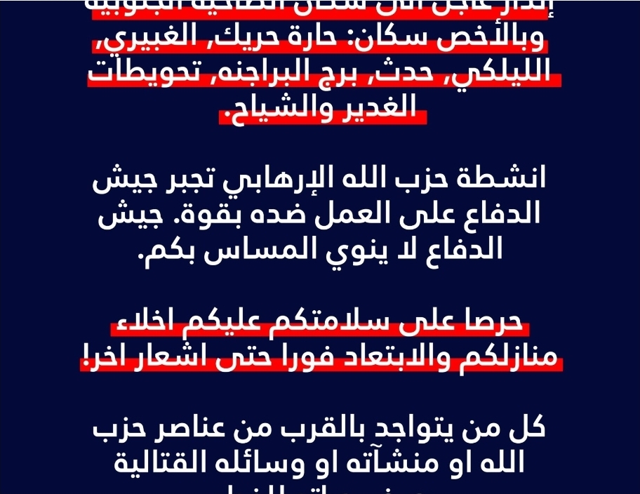 أدرعي ينذر سكان الضاحية الجنوبية