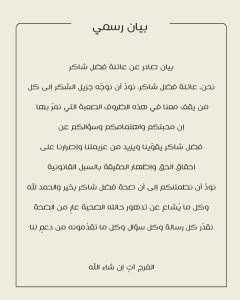 ونشر نجله محمد شاكر البيان عبر حسابه الرسمي على “إنستغرام”، وجاء فيه: