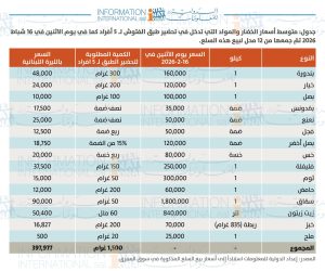 وقد تم احتساب الأسعار استناداً إلى متوسط أسعار الخضار والمواد الداخلة في إعداد الطبق، كما جُمعت من 12 متجراً لبيع هذه السلع بتاريخ الاثنين 16 شباط 2026.
