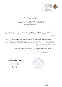 أصدرت رئاسة مجلس الوزراء في لبنان مذكرتين إداريتين تقضيان بإقفال جميع الإدارات العامة والمؤسسات العامة والبلديات لمناسبة عيد الفطر المبارك وعيد بشارة السيدة مريم العذراء.