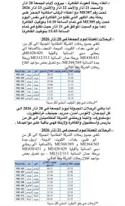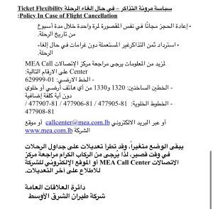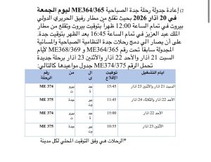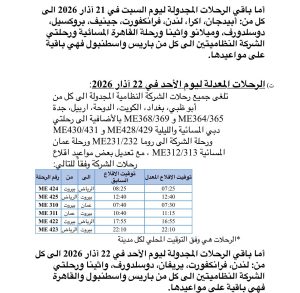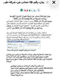 اعلنت شركة طيران الشرق الأوسط جدول رحلاتها من 20 ولغاية 23 آذار 2026، بسبب استمرار اغلاق المجالات الجوية في معظم دول المنطقة نتيجة التطوارات السائدة ولأسباب تشغيلية.