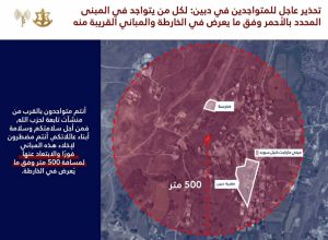 ووجّه تحذيرًا عاجلًا إلى سكان المباني المحددة بالأحمر في الخرائط المرفقة والمباني المجاورة لها في القرى التالية:
