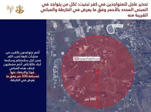 وقال: “أنتم تتواجدون في مباني يستخدمها حزب الله. من اجل سلامتكم انتم مضطرون لاخلاء تلك المباني والمباني المجاورة لها فورًا والابتعاد عنها لمسافة لا تقل عن 500 متر.