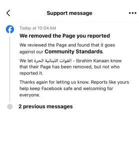 بنتيجة الشكوى التي تقدم بها النائب ابراهيم كنعان امام النيابة العامة التمييزية، بتاريخ ٩/١٠/٢٠٢٥، ضد من أنشأ صفحة على فايسبوك كتب عليها “Ibrahim Kanaan- القوات اللبنانية الحرة”، قامت إدارة فايسبوك، نتيجة التحقيقات القضائية التي أجرتها النيابة العامة التمييزية من خلال مكتب مكافحة الجرائم المعلوماتية، بالغاء الصفحة المذكورة، بعدما تبيّن أنّها صفحة وهمية اعتمدت لنشر أخبار كاذبة ضدّ كنعان.