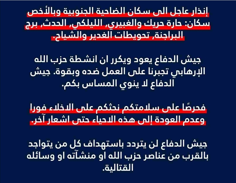 الجيش الإسرائيلي: نعود ونُكرّر تحذيراتنا إلى جميع المتواجدين في الضاحية الجنوبية عليكم إخلاء المنطقة فوراً