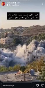 ونشرت حايك فيديو عبر خاصية “ستوري” عبر حسابها على “انستغرام”، للغارات الإسرائيليّة، أرفقته بالتعليق التالي: