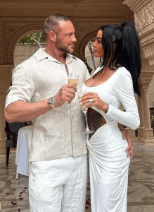 وبعد ذلك، التقط الزوجان صورًا إضافية بكؤوس الشمبانيا، قبل أن تلتقط كايتي صورًا منفردة بفستانها ذي الشق العالي والكعب المرتفع، مستعرضة وشومها العديدة.