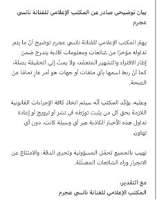 وجاء رد عجرم بعد تداول أخبار كاذبة ادعت ضمّ اسمها إلى ما يُعرف بـ”ملفات أبستين”، وهو ملف حساس للغاية. ونشرت هذه الادعاءات بعض الحسابات على الشبكات الاجتماعية دون أي دليل أو مصدر موثوق، مسببة أضرارًا معنوية لها ولعائلتها.