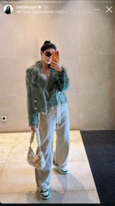 رياضي بتصميم شبابي باللونين الأبيض والأخضر. وأكملت الإطلالة بحقيبة يد مميزة من الفرو مع لمسة سلسلة ذهبية، ما أضفى على مظهرها لمسة فاخرة وعصرية.